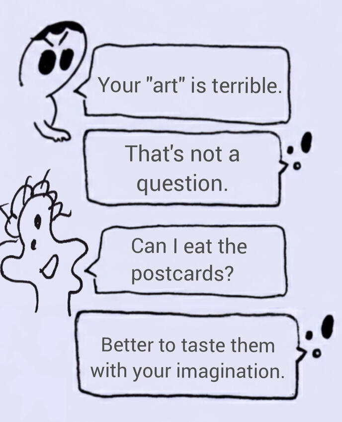 | Can I eat the postcards? | Better to taste them with your imagination, my dear. |